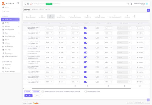 Gestioná imágenes, precios, presentaciones, características, stock y trazabilidad, categorización, datos públicos y privados, ofertas personalizadas, costos, utilidad y más.
